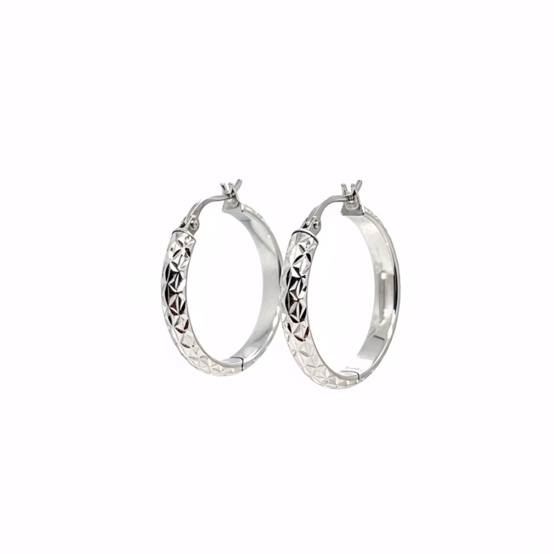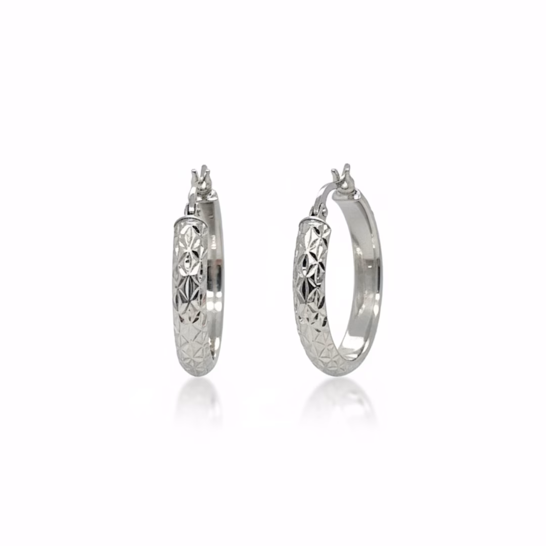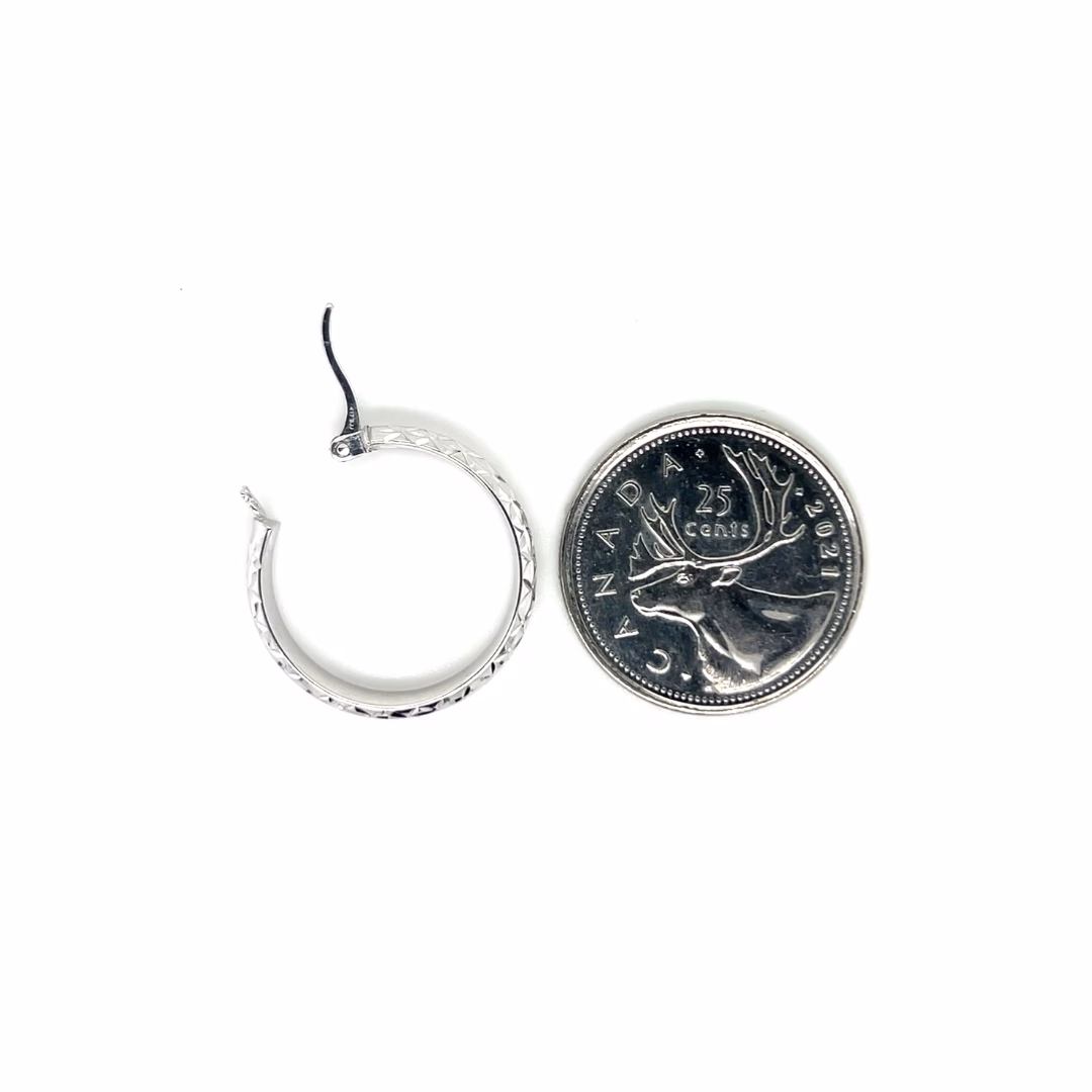 These classic hoop earrings are crafted from 10K white gold and finished with a precise diamond cut pattern, resulting in extra brilliance and eye-catching sparkle. The faceted diamond cut surface reflects light beautifully, enhancing the contemporary, radiant appearance of white gold. Elegant and versatile, these hoops can elevate both casual and formal outfits, offering effortless sophistication and polish. Lightweight and durable, they promise comfortable wear every day. Free jewellery cleaning available. Designed and handmade in Vancouver, BC, Canada.