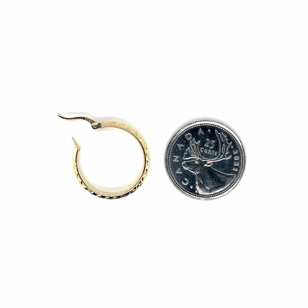 These elegant hoop earrings are expertly crafted from 10K yellow gold and feature a diamond cut finish, adding exceptional brilliance and texture to a timeless classic. The diamond cutting technique creates crisp, faceted surfaces that catch and reflect light with each movement, enhancing both sparkle and dimension. Lightweight yet durable, these hoops are versatile enough for both everyday wear and special occasions, delivering an effortlessly sophisticated look. Free jewellery cleaning available. Designed and handmade in Vancouver, BC, Canada.