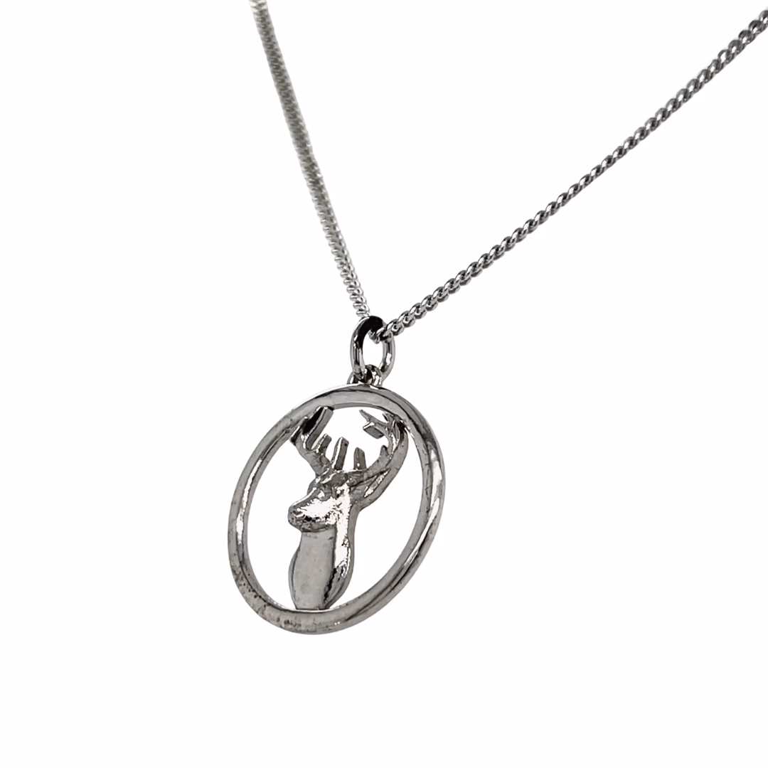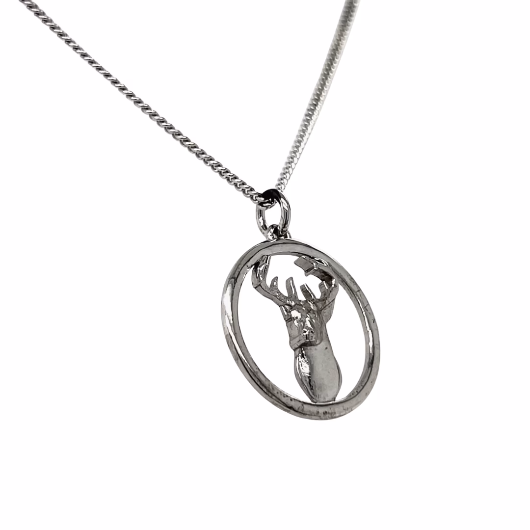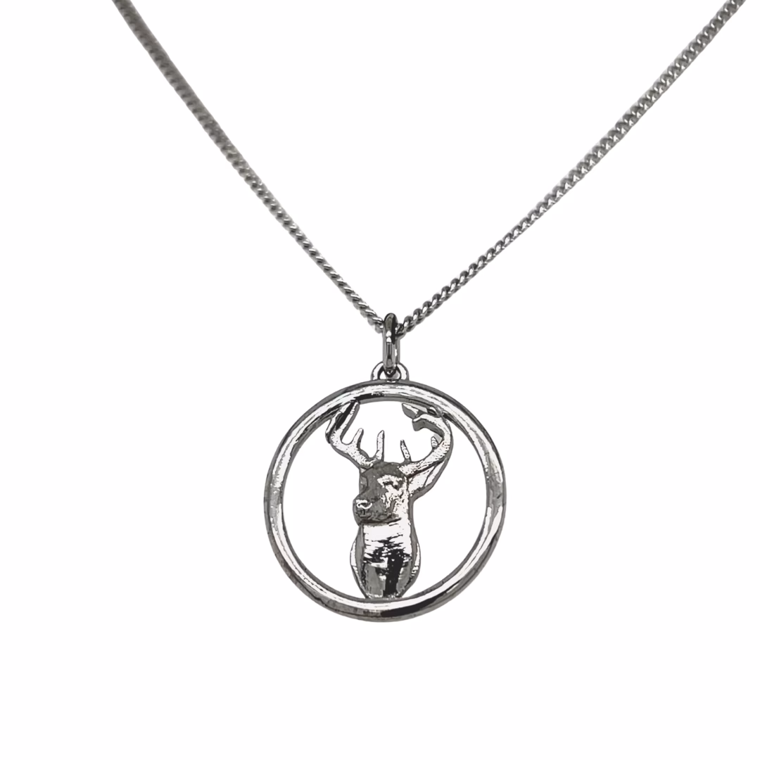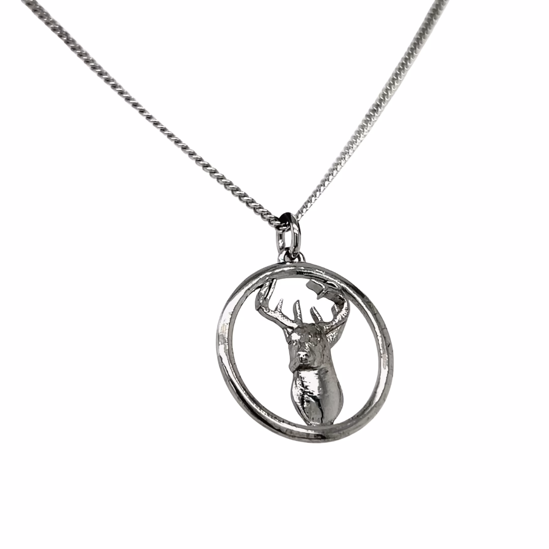 A striking pendant showcasing a finely detailed buck, with antlers gracefully extended and poised within a polished circular sterling silver frame. Measuring approximately 24.5mm in diameter, this pendant offers substantial presence while maintaining refined artistry. The design brings out the strength and elegance of the buck, making it an ideal piece for nature and wildlife enthusiasts.