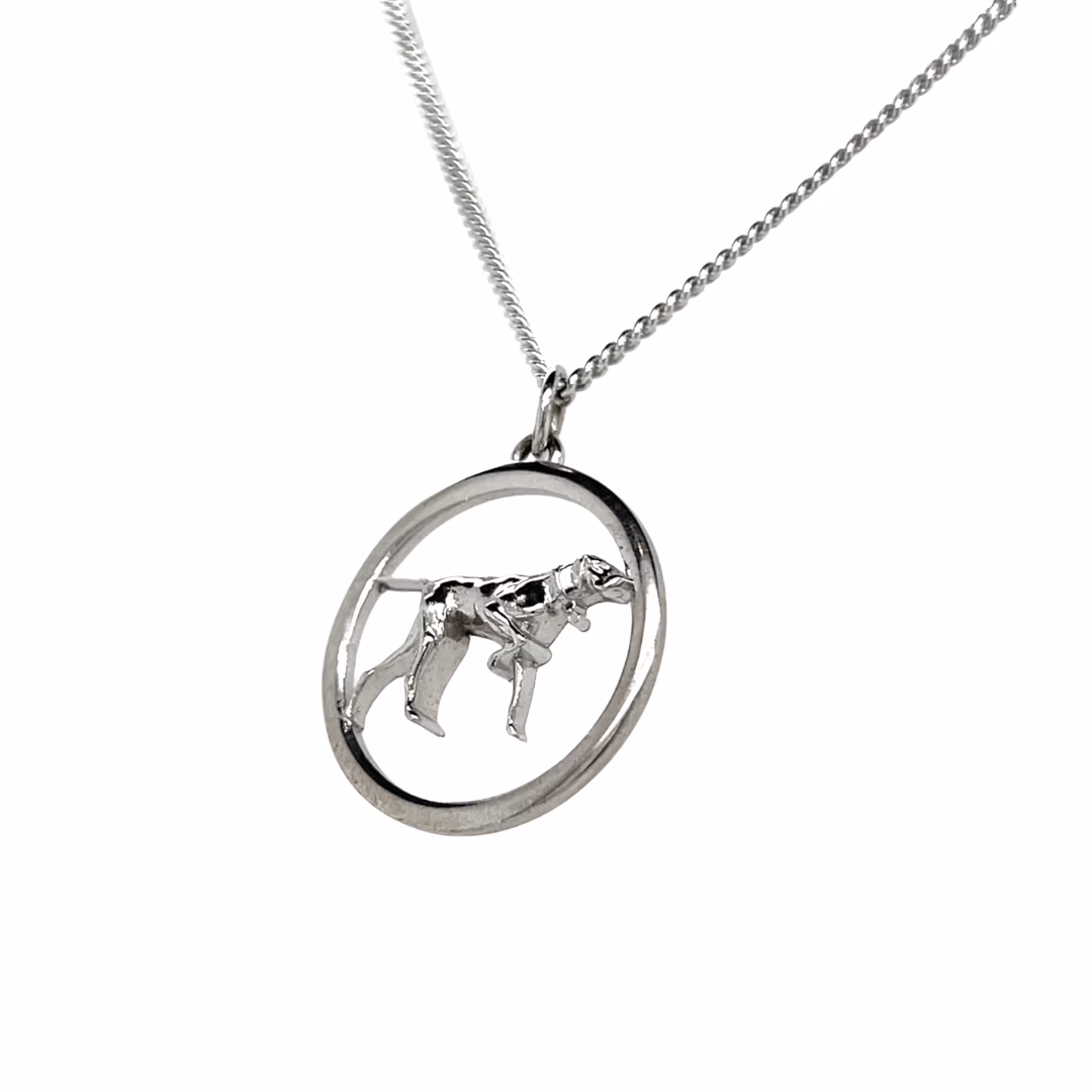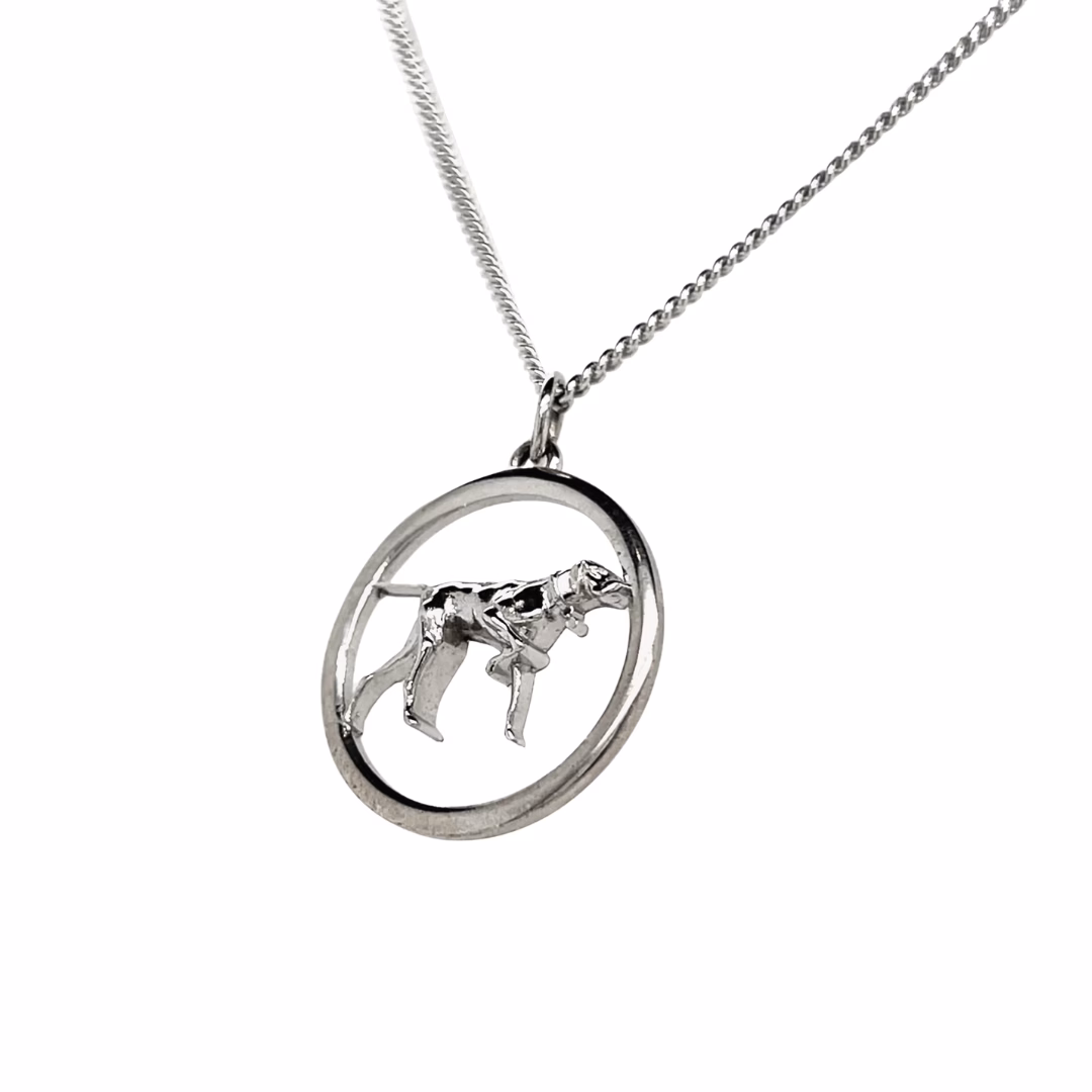 A finely detailed pendant featuring a pointer dog profile, thoughtfully cut out and framed within a polished circular sterling silver border. The pendant measures approximately 24.5mm in diameter, offering a bold and elegant look that captures the athletic character and poised stance of the pointer breed. The craftsmanship highlights both the silhouette and expressive features of the dog, making it a meaningful accessory for dog lovers and those drawn to animal-themed jewellery.